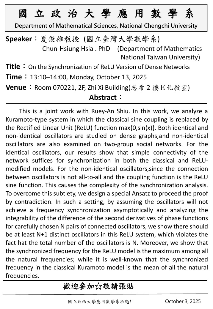 [演講日期2025/10/13] Chun-Hsiung Hsia . PhD (Department of Mathematics National Taiwan University) " On the Synchronization of ReLU Version of Dense Networks”