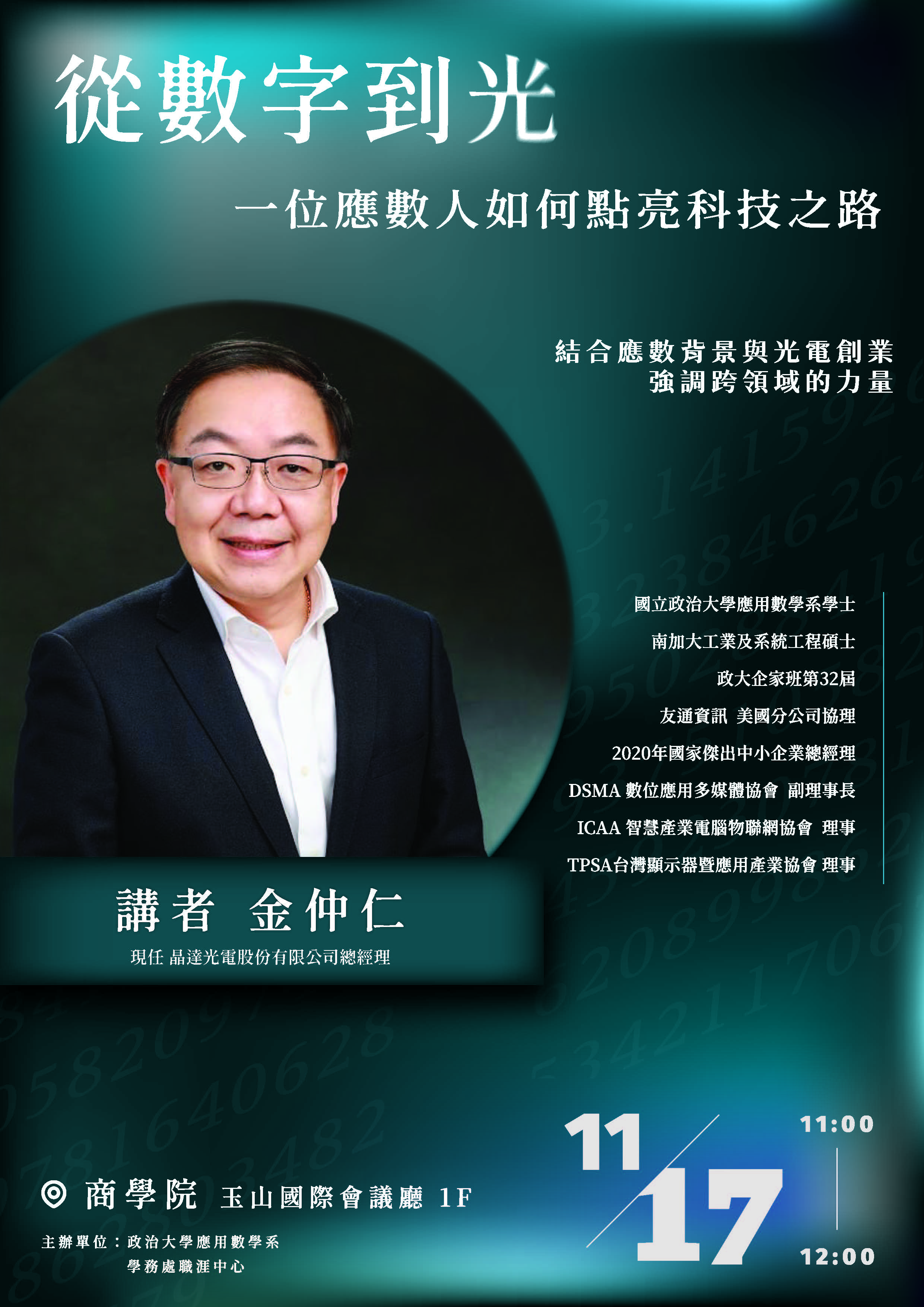從精確的數字邏輯到閃耀的光電創新,一位應數人如何以數學思維開啟科技創業的新篇章?本場演講將分享他從理論到實踐的轉折歷程,揭示跨領域結合的無限可能。讓我們一起見證「從數字到光」,如何點亮未來的科技之路!